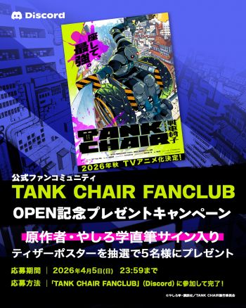 2026年3月18日(水)から2026年4月5日(日)23:59までに「TANK CHAIR FANCLUB」に登録いただいた方の中から抽選で5名様に原作者・やしろ学直筆サイン入りティザーポスターをプレゼント!